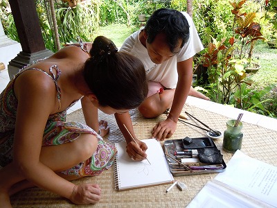 今回のバリで私は好きなタッチを描く画家のところへ技法を習いに行っていたのですが、机と椅子が用意されてる訳でもなんでもなく、写真のようにござの上でしゃがんで描くわけなんです。